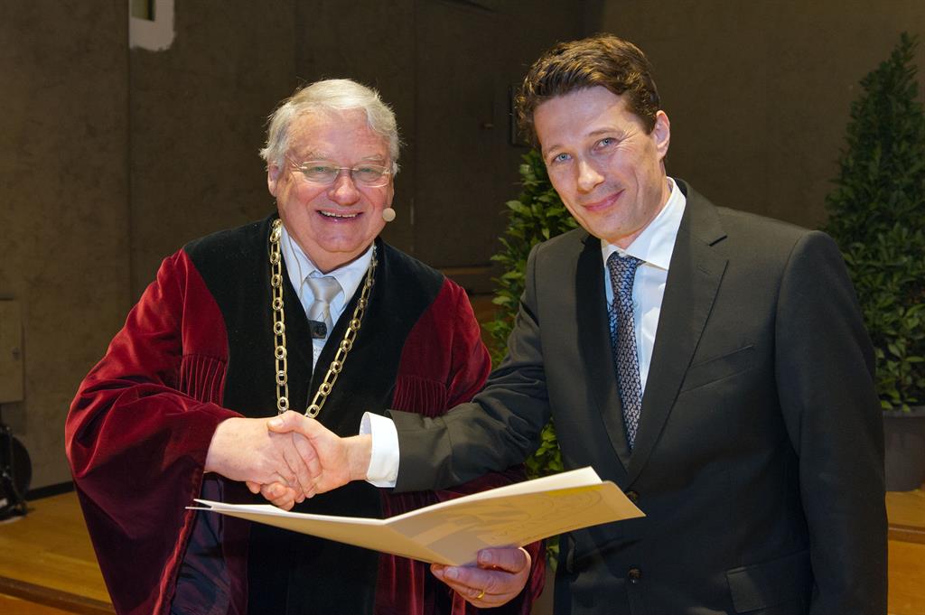Our congratulations to Gregor Koblmueller on being awarded the Arnold Sommerfeld Prize 2015 by the Bavarian Academy of Sciences for his leading work on the realization of Semiconductor nanowire heterostructures and their use for next generation electronic and photonic devices ! Gregor Koblmueller is one of the leading material scientists worldwide and has been active in WSI for many years working on the growth of such nanomaterials and the investigation of their fundamental properties. More information on the research topics for which he has received his prize can be found on the research pages of the nanowire subgroup of E24. The prize was presented by the President of the Bavarian Academy, Prof. Dr. Karl-Heinz Hoffmann as part of the annual general meeting of the academy in December 2015 (see photo). Join us in congratulating Gregor on this great recognition of the leading work performed by his group, his students and colleagues and wishing all a great start into 2016 !