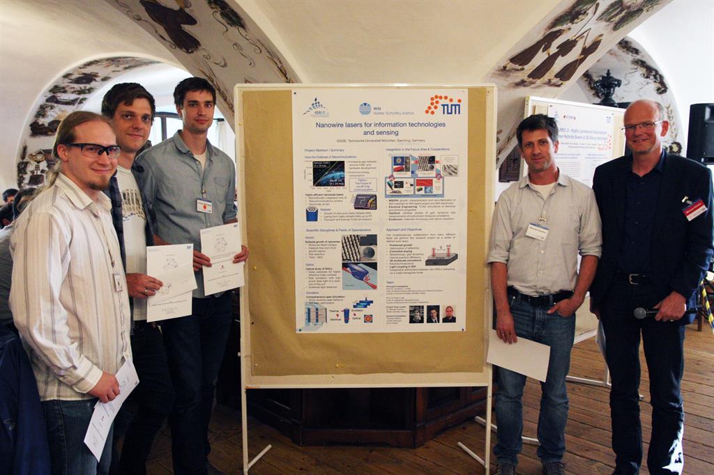 The “Nanowire lasers”-team (IGSSE Project 9.08) working at WSI-TUM (Chair Prof. J. J. Finley) and TUM-EE (Chair Prof. P. Lugli) were recently awarded the Best Poster Award at the 10th IGSSE Forum held in Raitenhaslach (June 1-4). The PhD students Thomas Stettner, Jochen Bissinger, Armin Regler and the Project Team Leader Dr. Michael Kaniber won the 3rd prize with their contribution entitled “Nanowire lasers for information technologies and sensing”. This collaborative IGSSE Project brings together students from the Physics Department/Walter Schottky Institut as well as from the Faculty of Electrical and Computer Engineering and explores the potential of III-V semiconductor nanowires as coherent light sources for applications in future optical on-chip and interconnects communication.