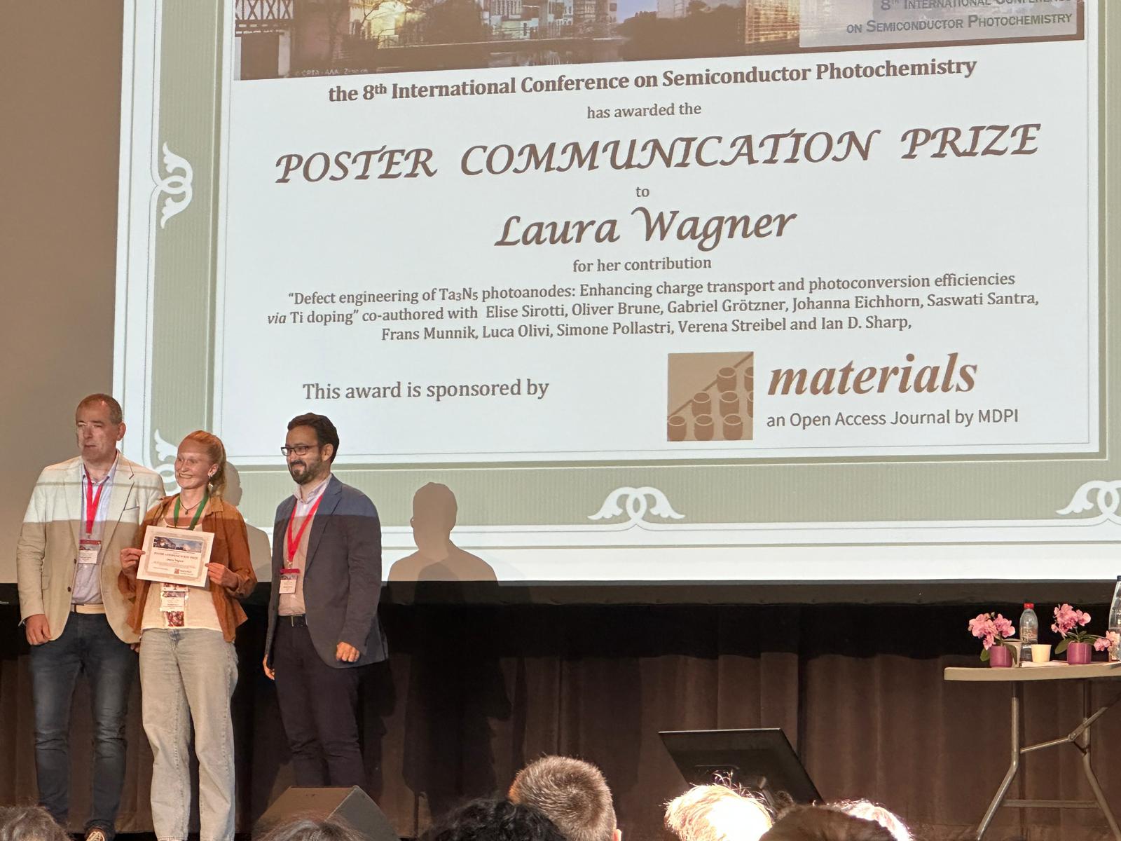 Congratulations to Laura Wagner, who received the Poster Communication Prize for her work entitled "Defect Engineering of Ta3N5 Photoanodes: Enhancing Charge Transport and Photoconversion Efficiencies via Ti Doping" at the 8th International Conference on Semiconductor Photochemistry in Strasbourg, France. Great work and congratulations on the well-deserved honor, Laura!
