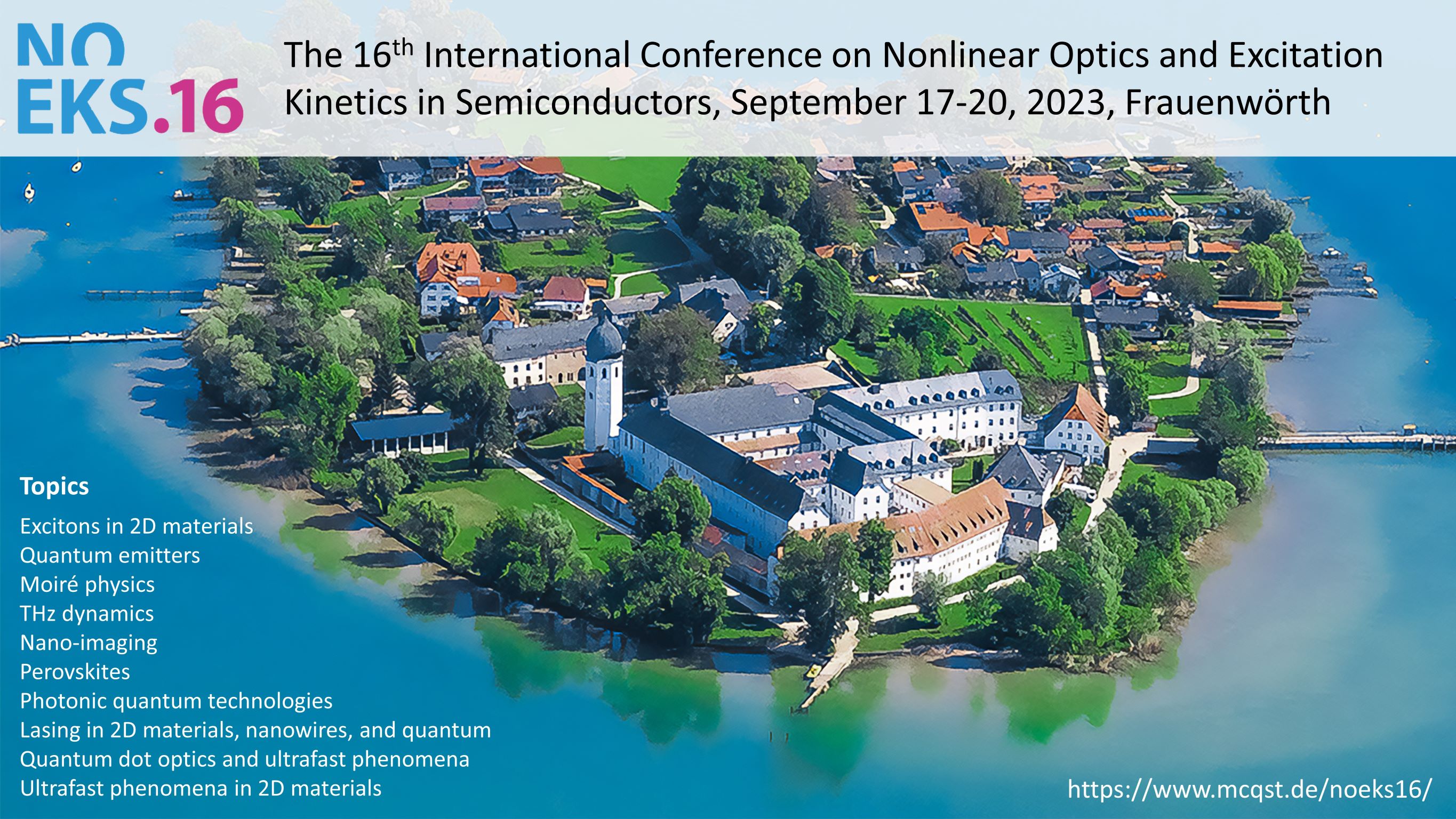 The WSI proudly organizes the 16th version of "The International Conference on Nonlinear Optics and Excitation Kinetics in Semiconductors" (NOEKS16) at the venue www.frauenwoerth.de from September 17 to 20, 2023. For more information, please check: www.mcqst.de/noeks16/ The local conference committee