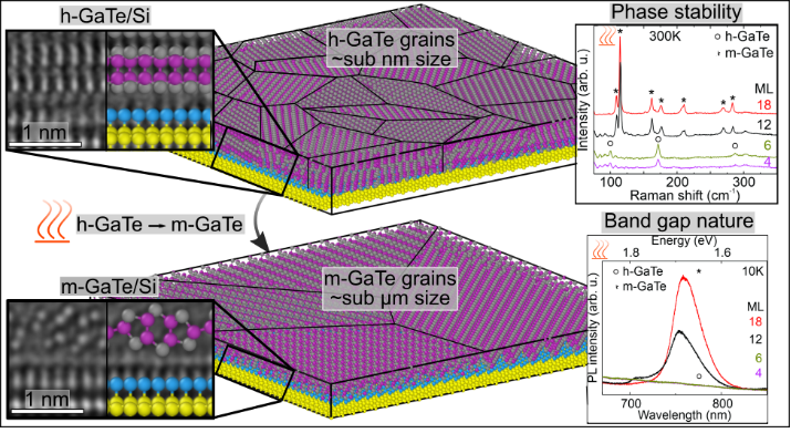 In our recent publication in npj 2D Materials and Applications (https://rdcu.be/c8u8o) we demonstrate the formation of atomically sharp interface and single crystal m-GaTe on the silicon substrate by using a two-step technique based on the phase transformation of h-GaTe. The control of both unstable phases and 2D anisotropic semiconductors on standard crystalline wafers may be a key ingredient for next-generation quantum and optoelectronic devices and novel thin layer-based multifunctional systems. The work has been carried out in collaboration with CNR Rome, INFN, MIET, and the Universities of Rome Tor Vergata and Milano Bicocca.