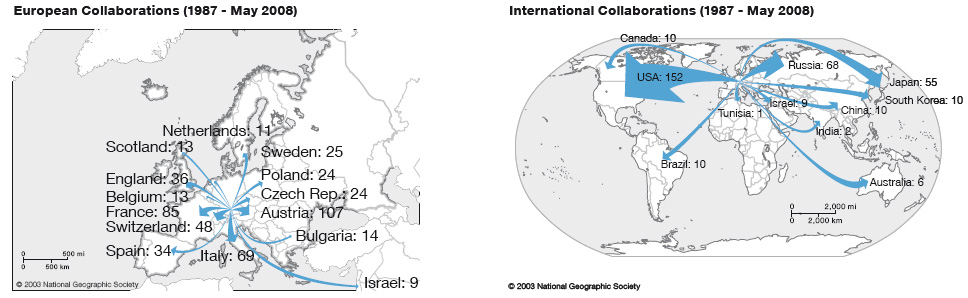 Number of joint publications that have been written between researchers in the Walter Schottky Institut and other groups in Europe (left panel) and worldwide (right panel). Source: ISI Web of Science, May 2008